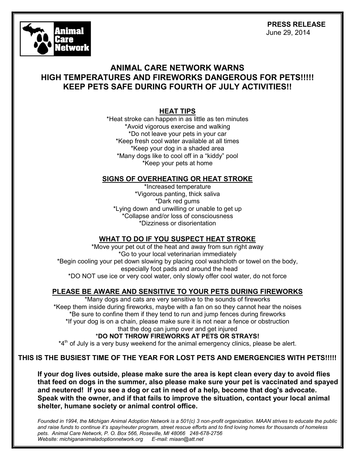 PRESS RELEASE HEAT-4TH OF JULY ACTIVITIES PETS 6-2014 By MAAN | Published June 30, 2014 | Full size is 1224 × 1584 pixels !cid_634BAB78-A94A-4872-BC7F-4EAE56664034@gateway_2wire Save Them All Grant Recipient Logo Bookmark the permalink.